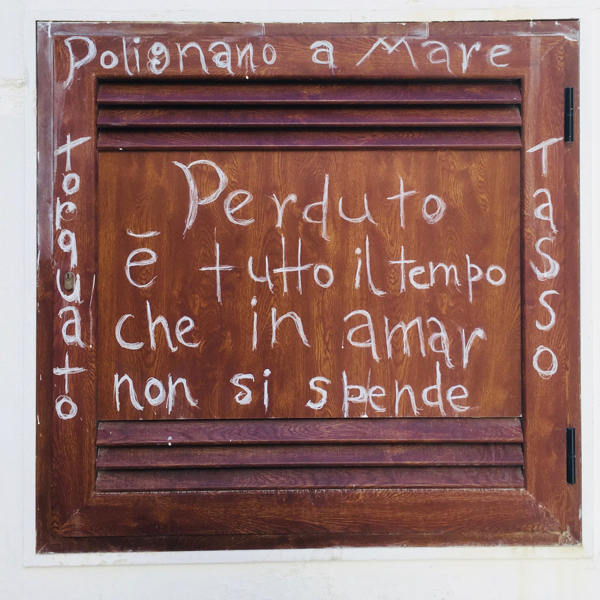 First day, we wanted to check out the area and decided to make our way to Polignano a Mare, which is easy to reach by train (6.50€, 1hour). The train rides once every hour only, so we had to wait a little bit- the price you pay if you do not plan your journey and look up the schedule. But waiting was so worth it. Even the ride through vine fields calmed me down to earth. Once there, we got lost in our own paradise. The town with its with houses is full of colours, cute little houses and some quotes by Torquato Tasso everywhere on the walls. Somehow, a place for lovers. Perduto e tutto il tempo che in amar non si spende (lost is all the time you do not spend in love) is written in Italien everywhere. Seems like love is everywhere here.