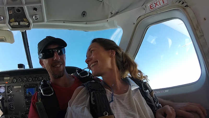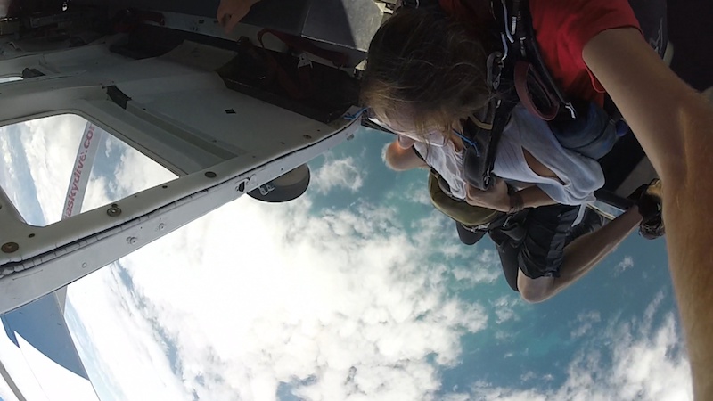 When the door of the airplane opened, I watched the other guys jumping out of the plane quickly like potato sacks. I felt my fear slowly coming up again. Watching the other skydivers jumping out of the airplane and feeling the air coming inside did not help to relax at all.