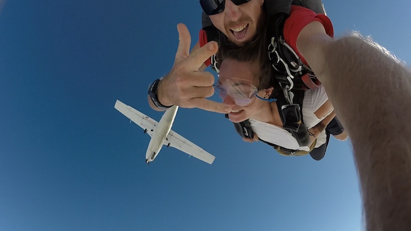 The free fall lasted for around one minute. Being surrounded by air was such a new feeling for me that I barely noticed how fast we fell down to earth. The air was super loud in my ears, I hardly heard my own scream. The wind was so strong that I could not close my mouth anymore or answer to the high five Alex tried to do with me. He did make some signs with his arms and I tried to remember the instructions he gave me earlier in the plane. But my head was pretty much empty.