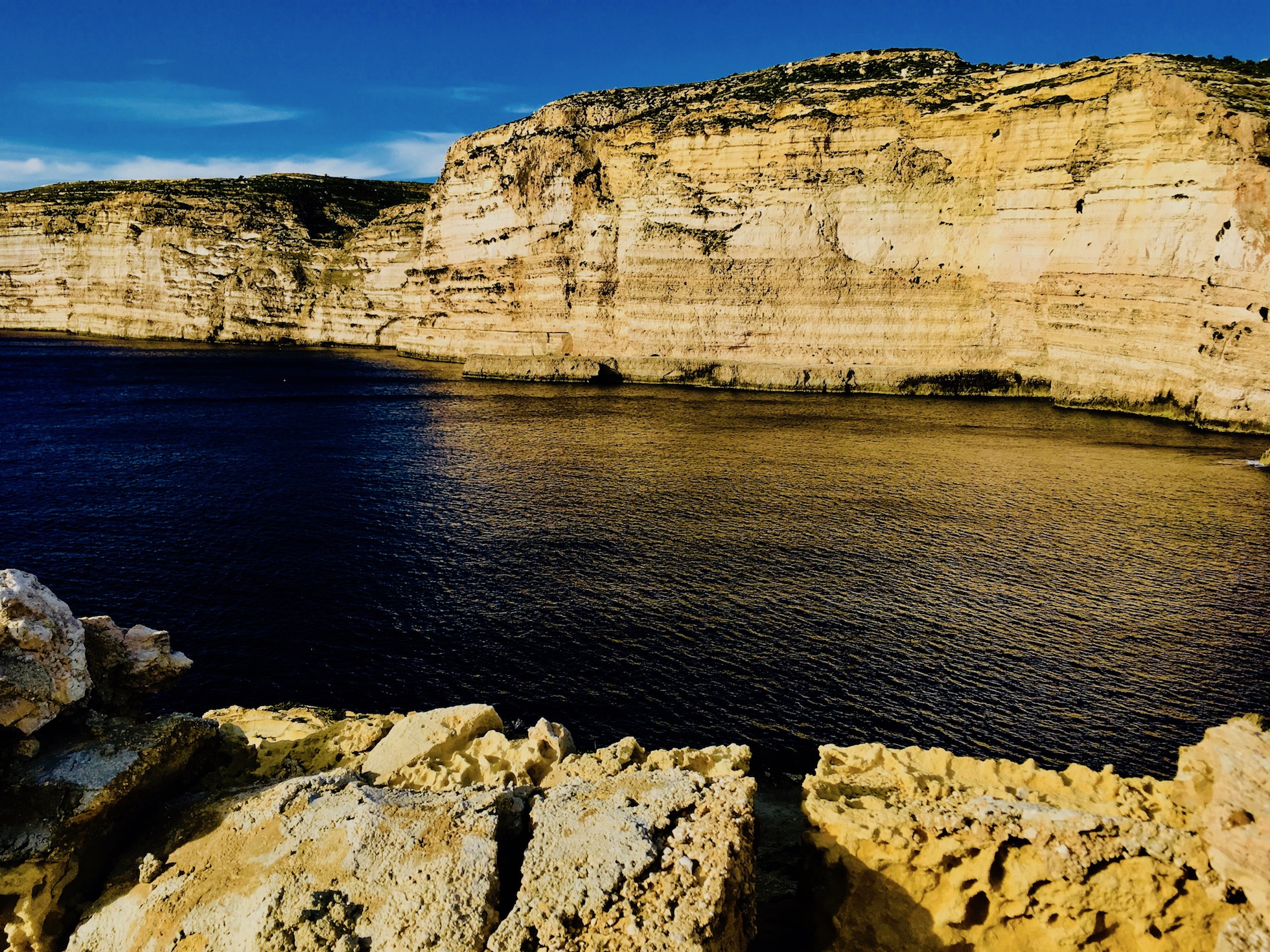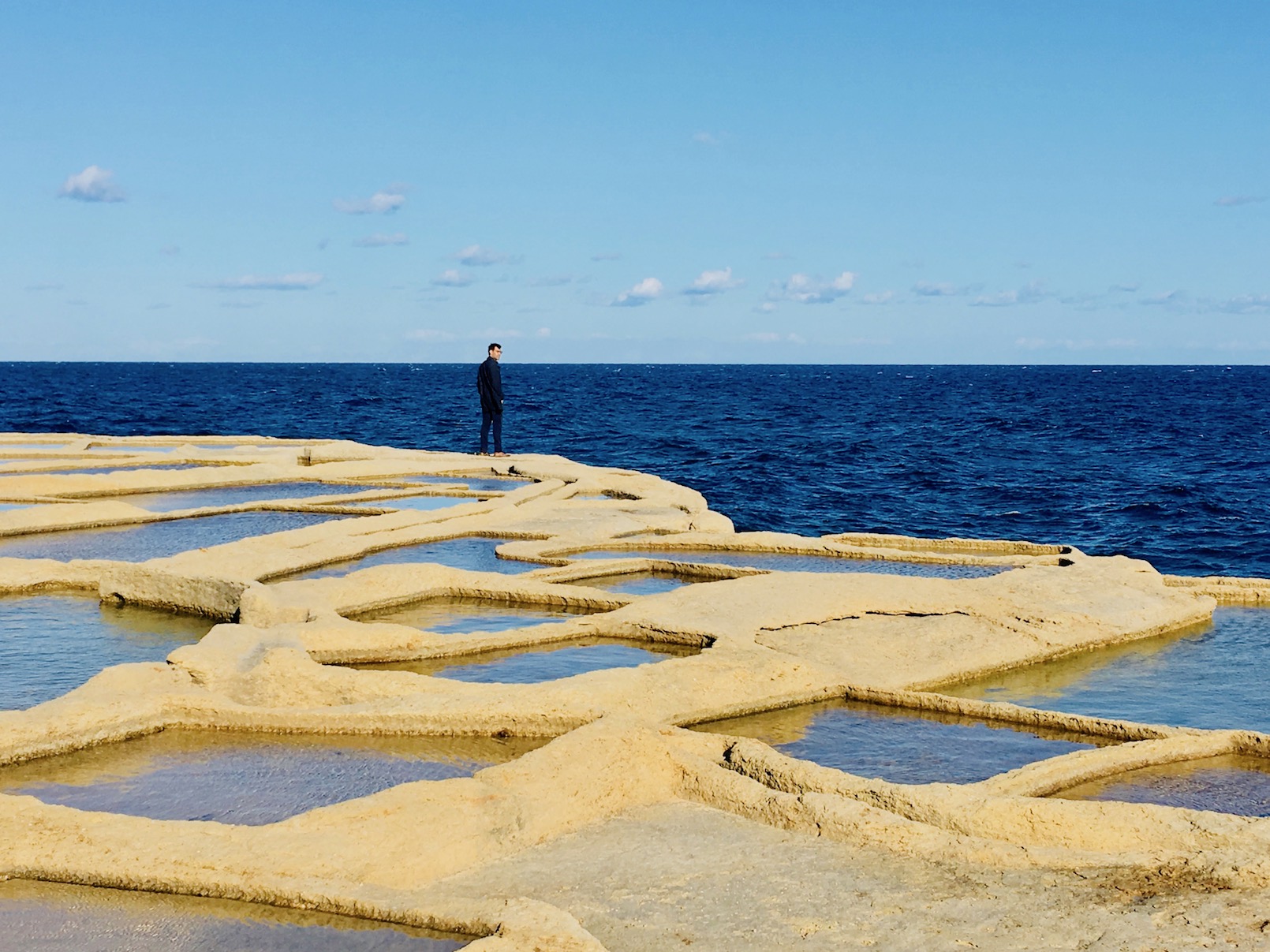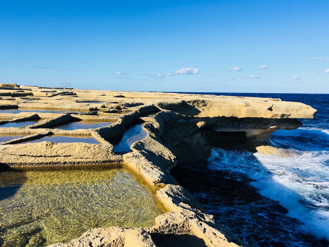 Sea salt is mined in Gozo at the salt pans next to Xwejni bay in Zebbug. The salt fields are impressive. Small catch basins were built high on the offshore rock plateaus from mud more than 300 years ago. The sun evaporates the water and leaves thick salt lumps. The air smells salty and the location invites for beautiful pictures. We found this place by accident and were so happy about our discovery. It seems to be a pretty famous place anyways, but at low season you are probably going to be the only one there.